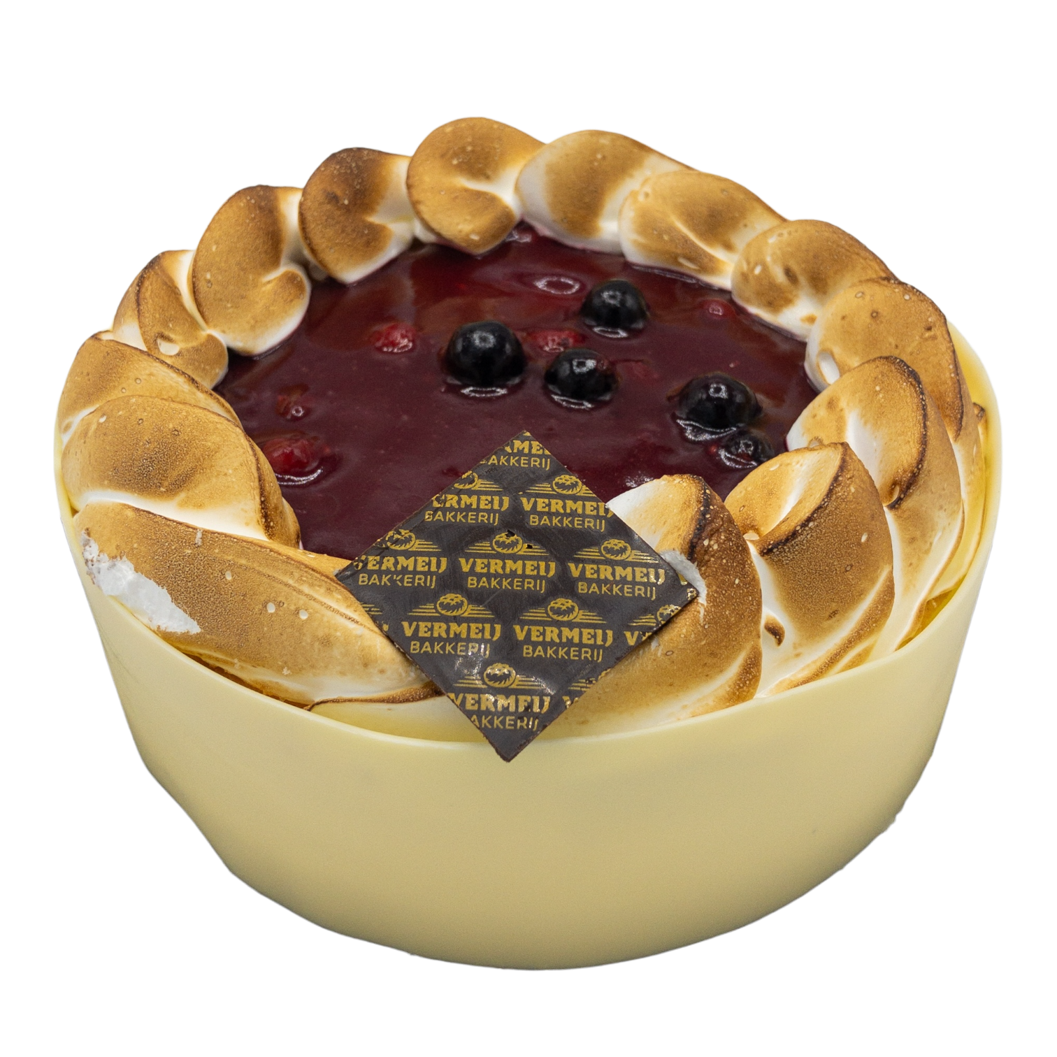 Desserttaartje met frambozenvulling en witte chocola